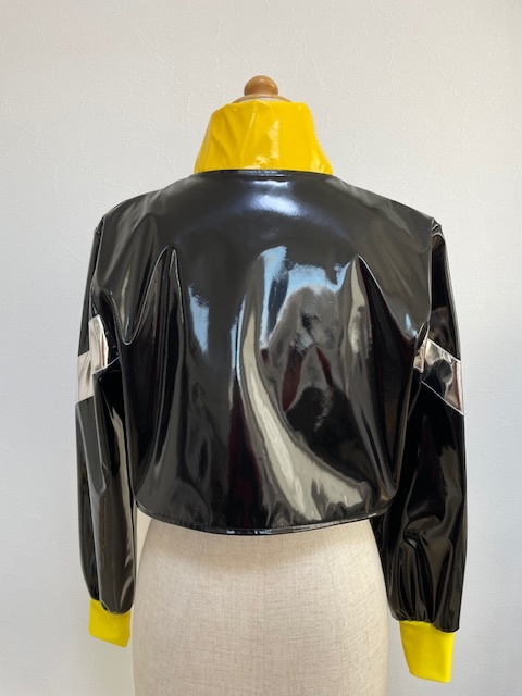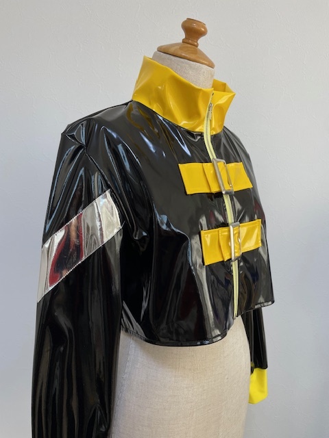 エナメル生地のショート丈ジャケットと綿ツイル生地のプリーツスカートのセットアップです。フロントのベルトがポイントになっています・黄色のエナメルセットとスカートが共通になっていて、チームの衣装統一感が素敵です